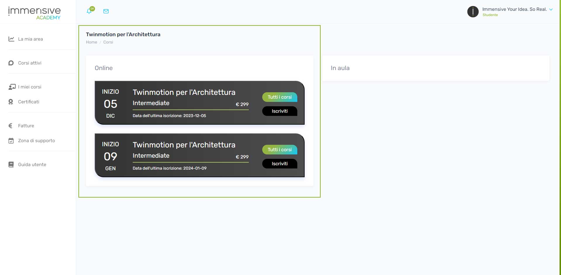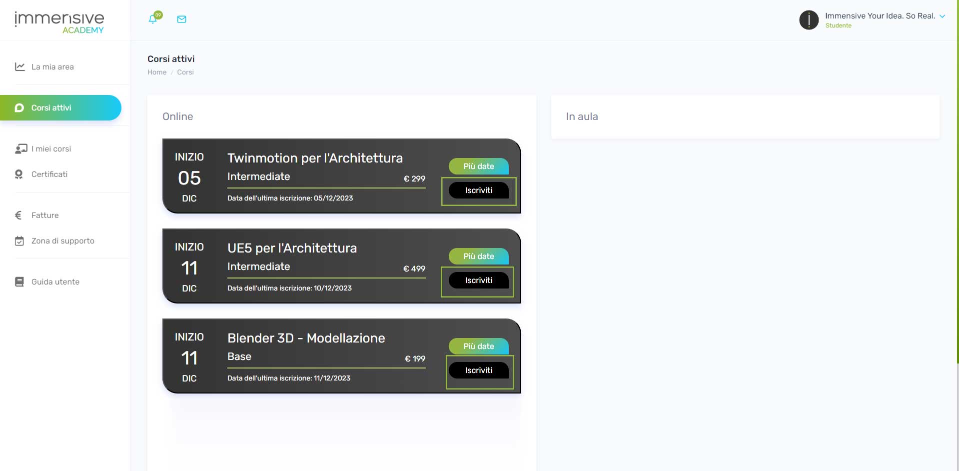 Nella sezione Online ed In aula è possibile visualizzare una lista dei corsi attivi ed aperti alle iscrizioni. I corsi online vengono svolti tramite la piattaforma. I corsi In aula vengono svolti nella seda operativa Immensive.