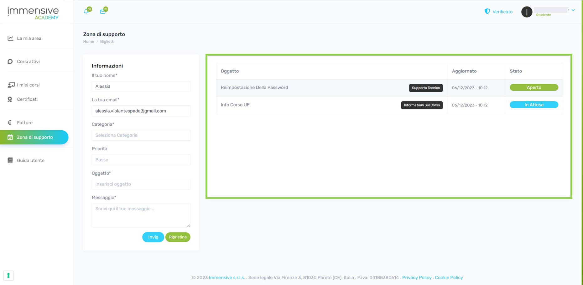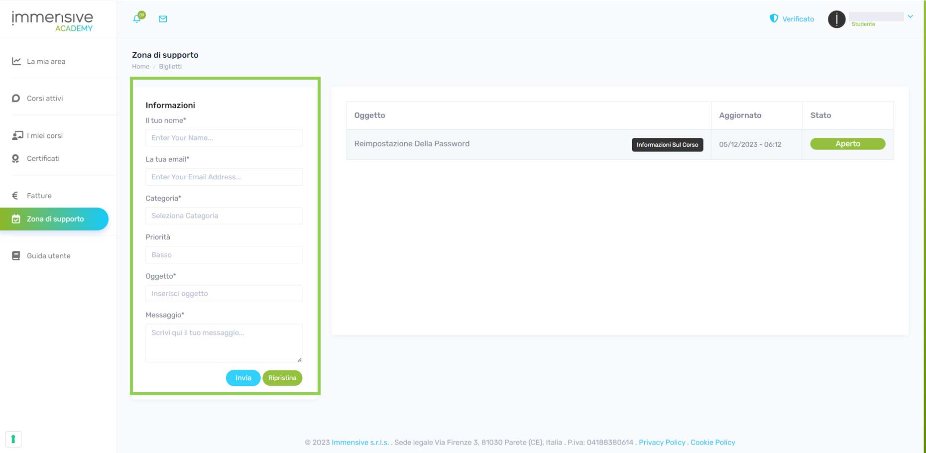 - Categoria del Ticket: Seleziona tra opzioni come Fatturazione, Supporto Tecnico, Informazioni sul Corso o Altro per indirizzare il ticket all'area appropriata.
