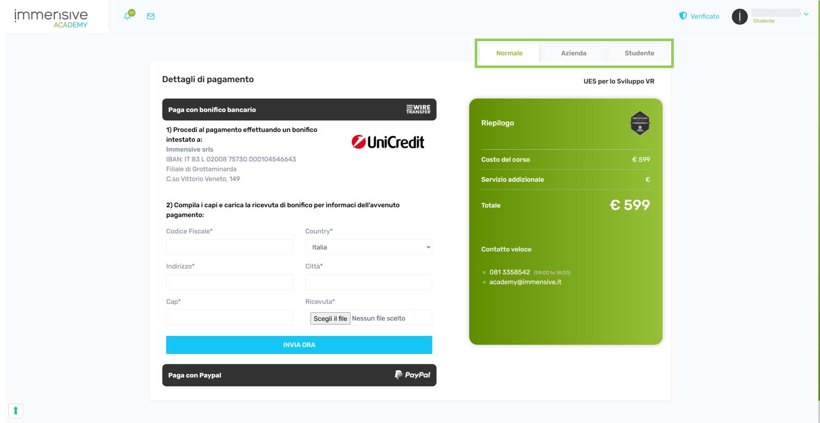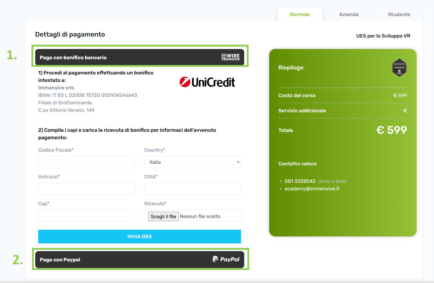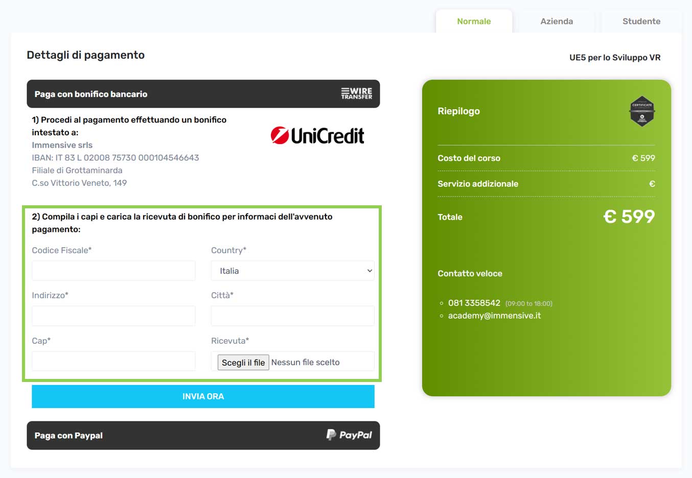 Dopo aver scelto il corso desiderato e cliccato su Paga Ora, verrai guidato alla Pagina di Pagamento.
