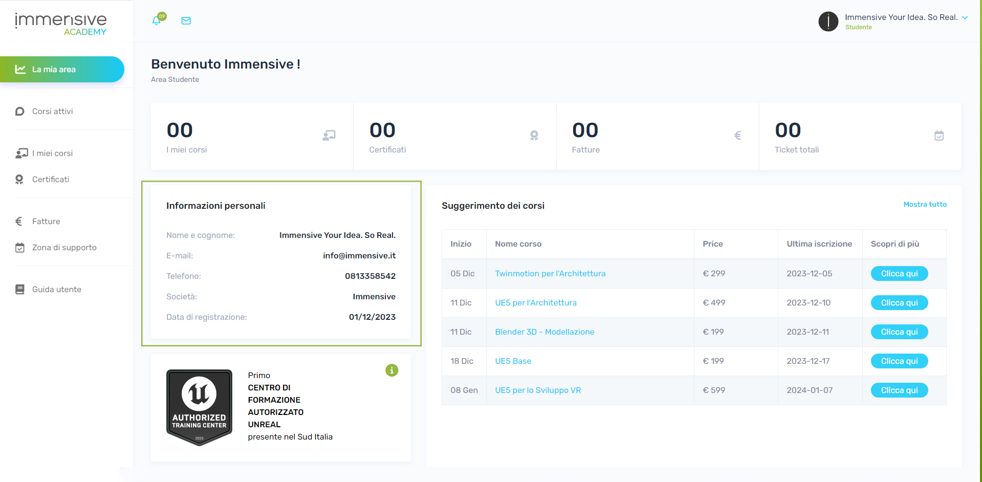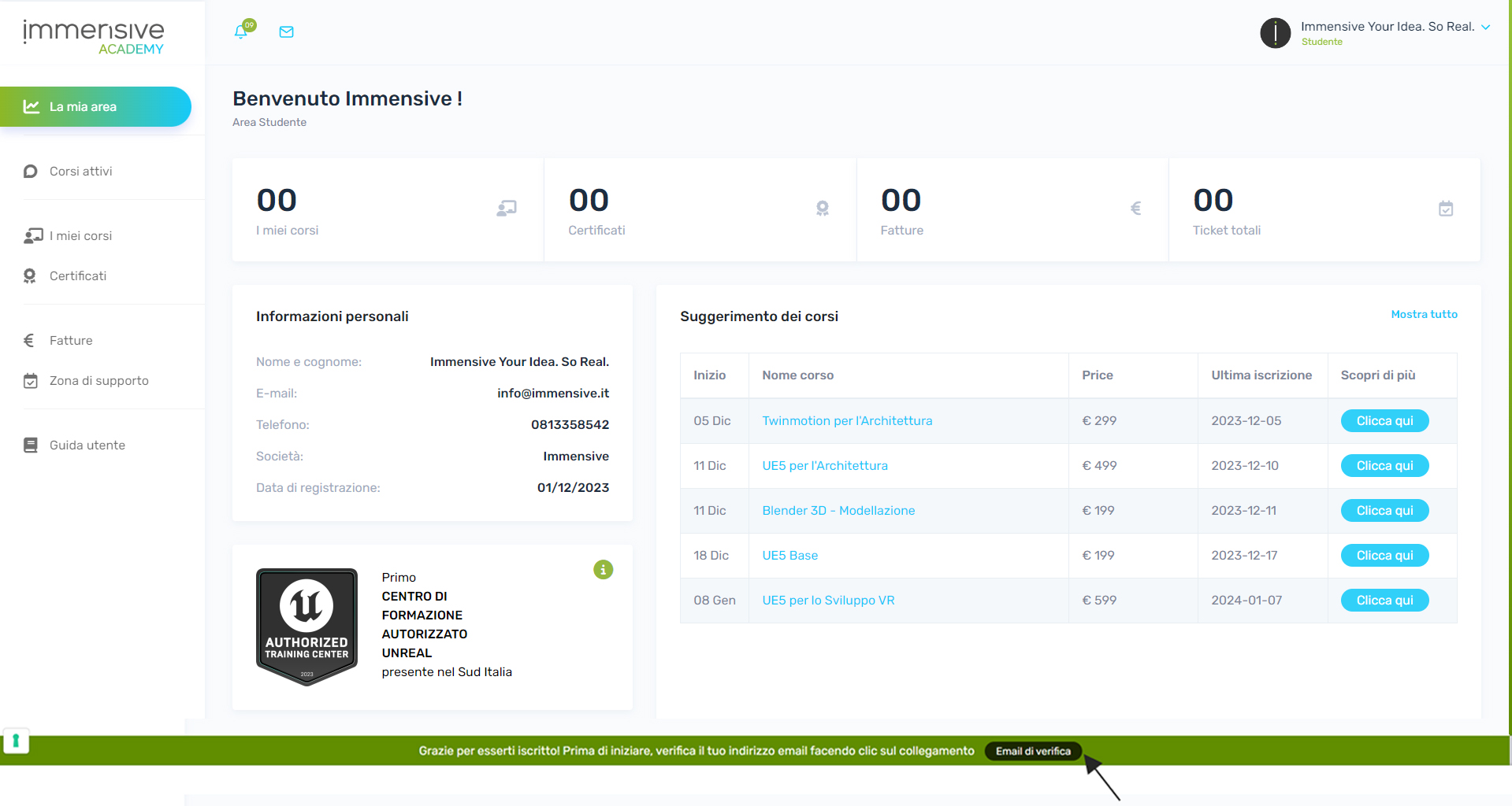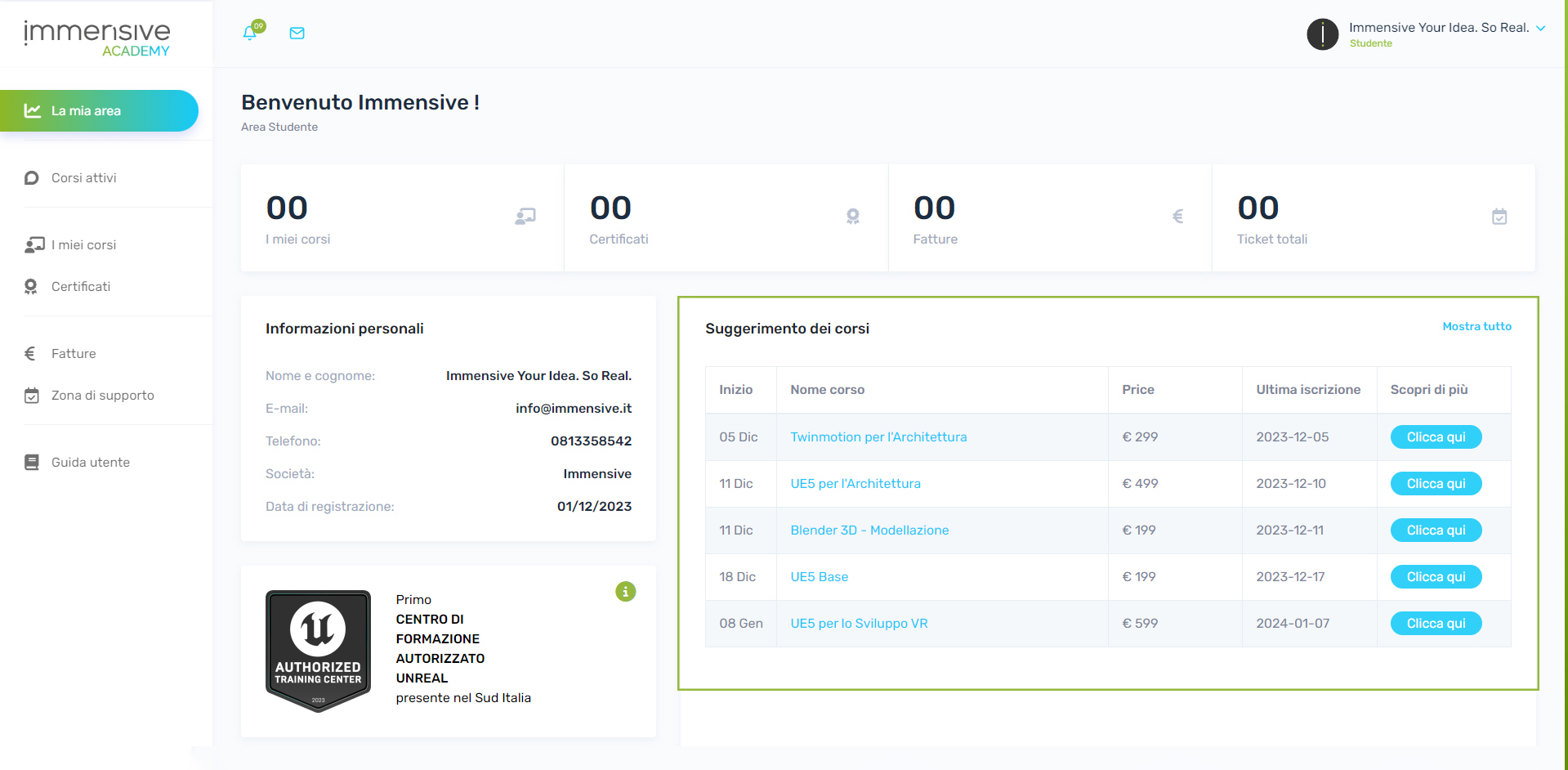 Mentre intraprendete il vostro percorso di apprendimento all'interno di Immensive Academy, vi incoraggiamo a sfruttare le diverse funzioni offerte. La piattaforma è progettata non solo per fornire accesso ai corsi, ma per migliorare la vostra esperienza di apprendimento complessiva. L'interfaccia intuitiva e il design user-friendly sono studiati per soddisfare le vostre esigenze educative.